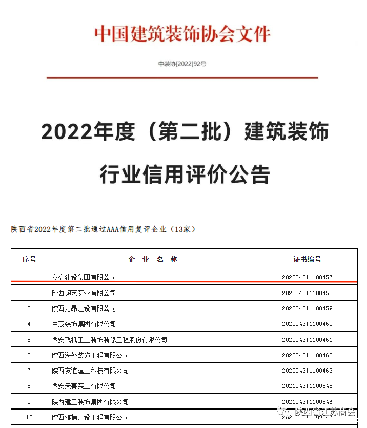 近日,中国建筑装饰协会正式发布2022年度(第二批)建筑装饰行业信用评价复评公示名单,必威安卓常务副会长单位、立豪建设集团有限公司凭借多年的诚信经营和优秀的履约能力,再度获评AAA级最高等级信用评定。这是立豪集团自2015年首次参评以来连续8年获评最高信用等级。